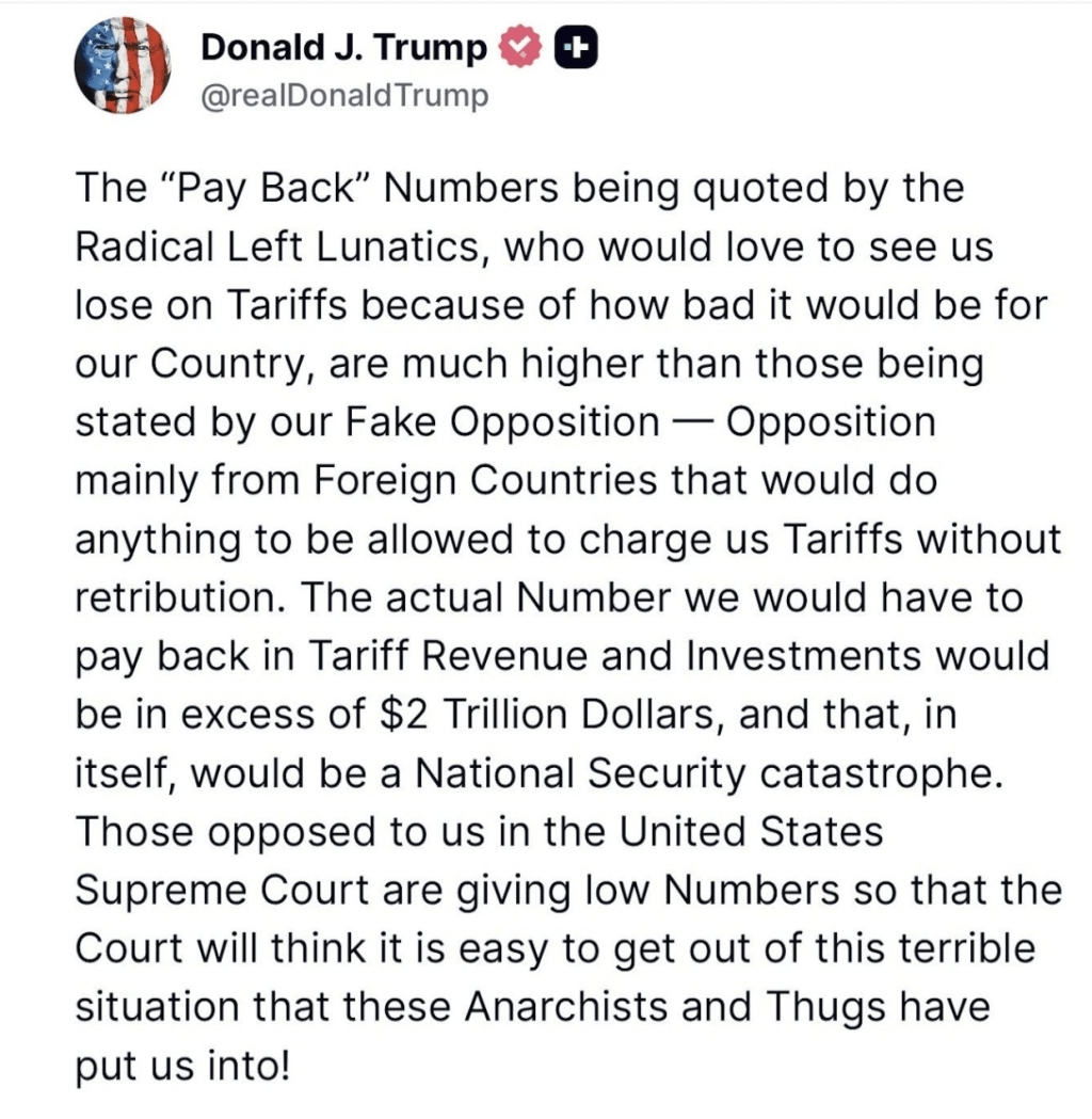 他隨后再度發帖,強調若法院最終裁定其動用IEEPA征收關稅的行為違法,所造成的后果將遠超外界預期?!胺磳ε烧f美國可能要退還2萬億美元,但真實數字要高得多。我們實際須償還的關稅與投資金額可能超過20萬億美元,那將是一場國家安全災難?!碧乩势张u部分人士“故意低估潛在代價”,試圖讓法院誤以為“美國能輕易擺脫困局”。