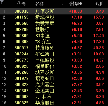 多只房地產個股表現活躍,財信發展(000838.SZ)午后開盤即直線封板,新城控股(601155.SH)、我愛我家(000560.SZ)、世聯行(002285.SZ)等跟漲,漲幅均超5%。此外,ST中迪(000609.SZ)和*ST榮控(000668.SZ)也封于漲停。