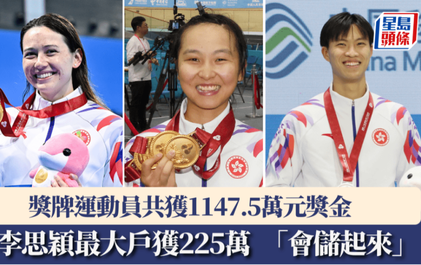 香港運動員在今屆全運會取得歷來最佳成績,奪得9金2銀8銅,合共19面獎牌,無論是金牌數目和獎牌數目都創港隊同一屆全運新高。獎牌選手共獲得1147.5萬元(港元,下同)馬會獎金,當中取得3面金牌的單車選手李思穎(Ceci)共有225萬元成為最大戶,她回復《星島頭條》時表示會將獎金“儲起來”。
